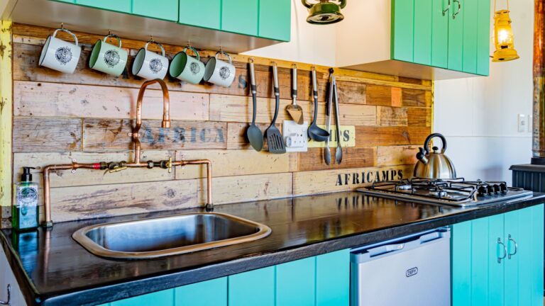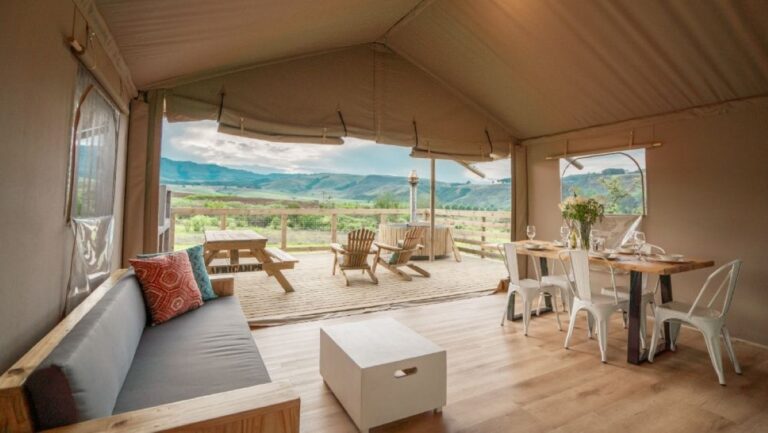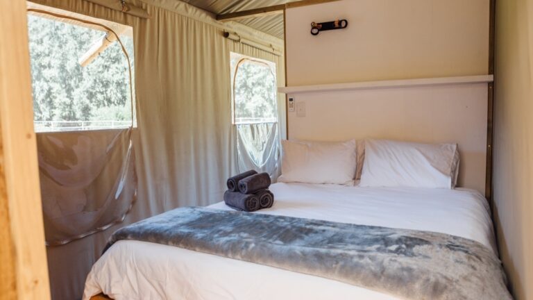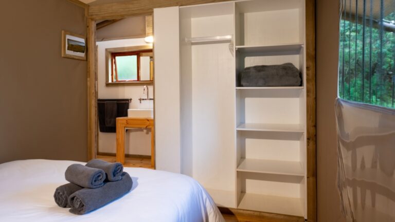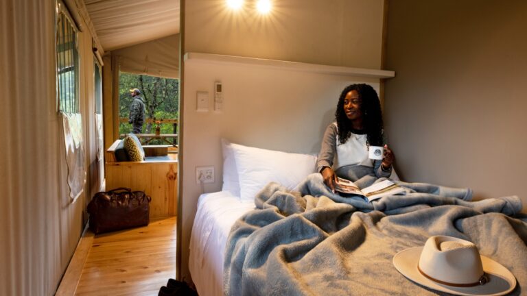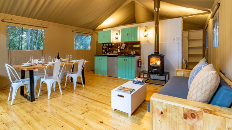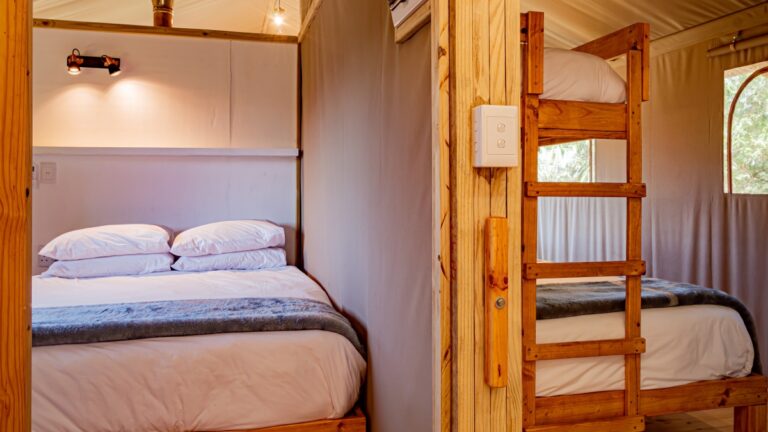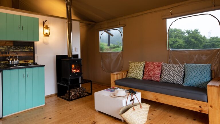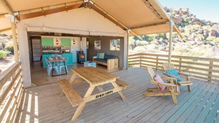Experience the perfect blend of comfort and nature in one of AfriCamps’ ten fully furnished boutique glamping tents. Enjoy life’s little luxuries, including an indoor fireplace, a fully equipped open-plan kitchen, and a spacious living and dining area. Each tent features two separate bedrooms with extra-long queen-size beds, electric blankets, and a bathroom with a shower. Relax on the deck with an outdoor wood-fired hot tub, stay connected with Wi-Fi, and enjoy the comfort of air conditioning, all while immersing yourself in the beauty of nature.