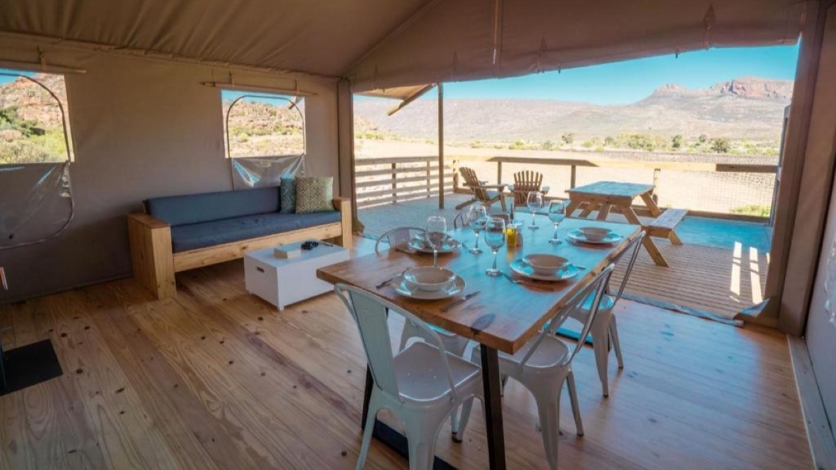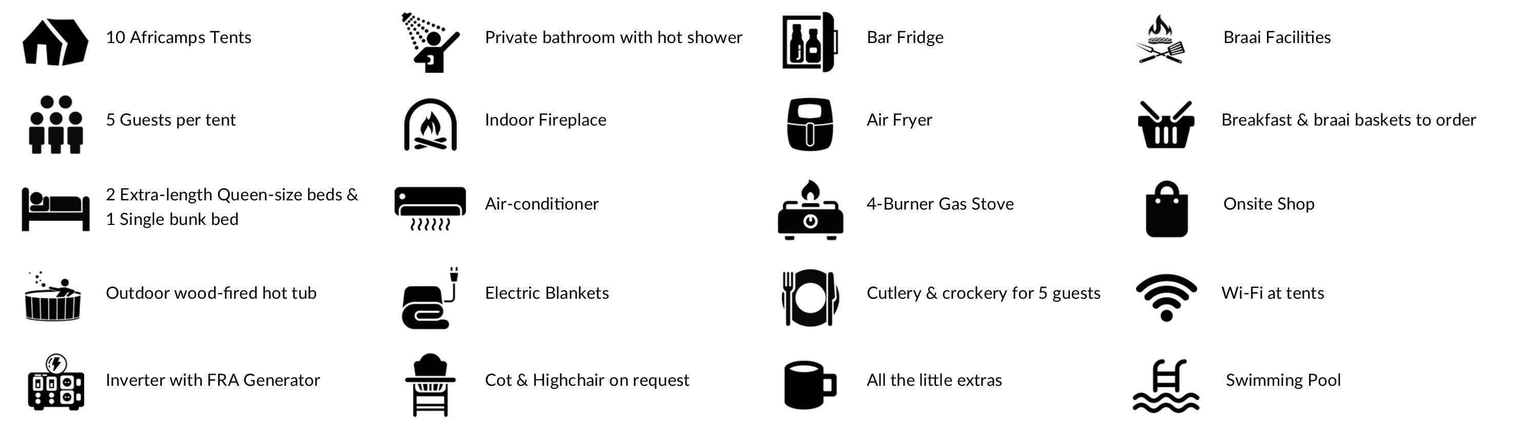 Experience the perfect blend of comfort and nature in one of AfriCamps’ ten fully furnished boutique glamping tents. Enjoy life’s little luxuries, including an indoor fireplace, a fully equipped open-plan kitchen, and a spacious living and dining area. Each tent features two separate bedrooms with extra-long queen-size beds, electric blankets, and a bathroom with a shower. Relax on the deck with an outdoor wood-fired hot tub, stay connected with Wi-Fi, and enjoy the comfort of air conditioning, all while immersing yourself in the beauty of nature.